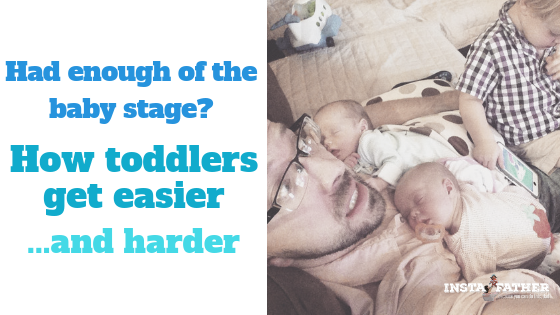 Toddlers are probably sleeping better. I don't know if I can emphasize this one enough, especially as a dad of a former colicky baby and of twin babies. I am still far, far, far away from feeling regularly rested; I could fall asleep mid-sentence if you gave me the opportunity. But it is now normal for us to get six hours of sleep. Sure, a mini-pause or three occurs because a kid comes into our room or I'm settling them back down, but compared to being up an hour at a time rocking a baby back to sleep? And then doing that again 45 minutes later, all night? It can be a game changer. I'd say it's one of the biggest differences because you don't realize how tired you've been until you realize how much your eyes used to hurt simply by having them open. You're gonna deal with wet sheets and nightmares and the like, but that's not even close to dealing with night nursing or colic or general overnight fussiness that will make you lose your mind.